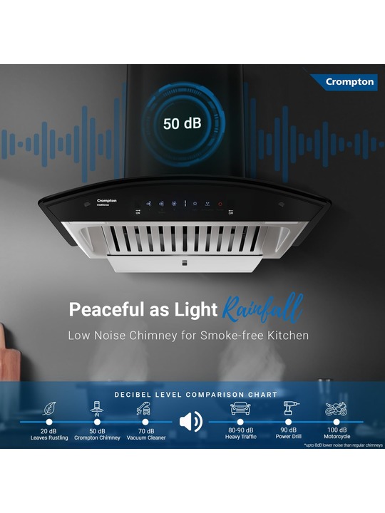 Low Noise - Crompton IntelliSense chimney operates at a minimum noise level of 50 dB, ensuring a quiet and peaceful cooking environment.