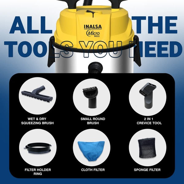 Included Components 1 N Main Motor Unit, 1 N SS Container, 1 N Hose Pipe with Handle Grip, 3 N Extension Pipes, 1 N Wet & Dry Squeezing Brush, 1 N 2-in-1 Crevice Nozzle, 1 N Small Round Brush, 2 N Cloth Filters, 1 N Sponge Filter, 1 N Carry Handle, 2 N Handle Screws, 4 N Wheels, 1 N Filter Holder Ring, 1 N Instruction Manual cum Warranty Card1 N Main Motor Unit, 1 N SS Container, 1 N Hose Pipe with Handle Grip, 3 N Extension Pipes, 1 N Wet & Dry Squeezing Brush, 1 N 2-in-1 Crevice Nozzle, 1 N Small… See more