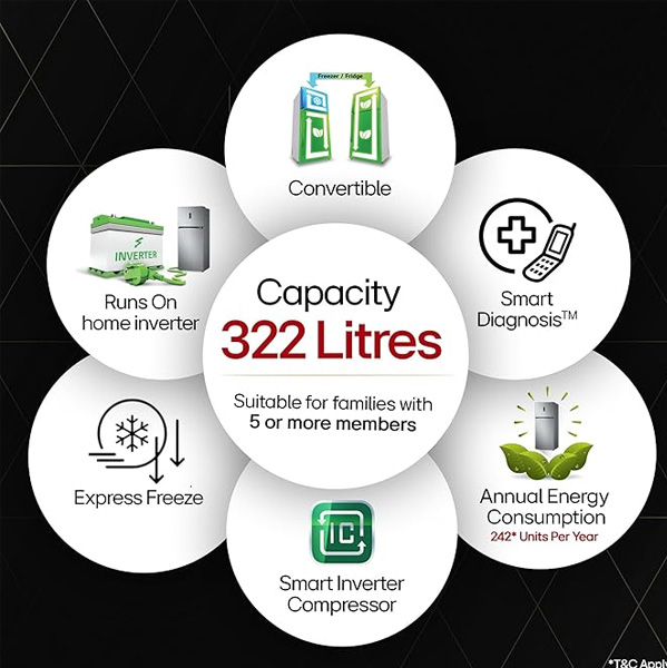 Frost Free Refrigerator greater than 300 L: Auto defrost function to prevent ice-build up Capacity 322 L: Suitable for families with 5 or more members I freezer capacity: 81 L, fresh food capacity: 241 L Energy Rating 3 Star: Energy efficiency Manufacturer warranty: 1 year on product, 10 years on compressor T&C Smart inverter compressor – energy efficient, less noise & more durable Storage or Interior description: Total no of shelves - 02 (Trimless Tempered Glass); Vegetable box Capacity - 28 Ltr. (GPPS Transparent), Pull out tray – Slide out for easy reach, Egg Tray, Anti-bacterial gasket – Protects food from bacteria & dust, Anti rat bite (Steel Sleeve)