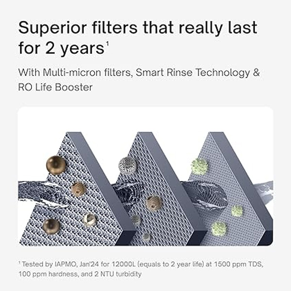 Introducing 2 year filter life: Save up to ₹13,500 on total ownership and service costs over 6 years with smart rinse technology that needs no service for 2 years. (Tested in government-certified labs up to 1500ppm TDS, 100ppm hardness, and 1 NTU turbidity. Actual results may vary based on water input)
